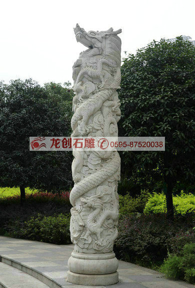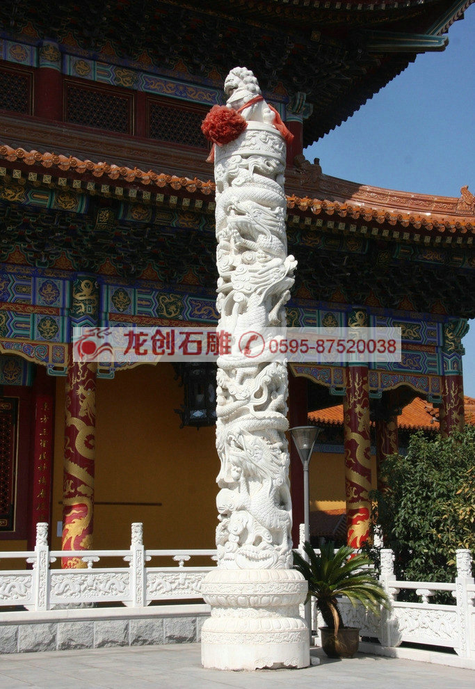 龍柱一般常見的都為石造浮雕華表,柱身圓形,雕有盤龍等紋飾,往往綜合運用立體圓雕,透雕和里地引起的淺浮雕等技法于一體。柱頭和華麗的八角底座及四周石欄桿雕凸起蜿蜒之行龍與四個角柱上蹲獅組合,襯托出龍柱浮雕特具的素滌華貴之美。