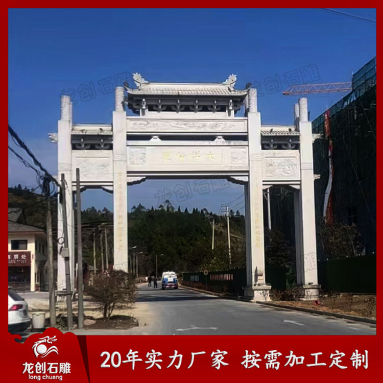 中西方風格融合的現代造型設計石牌坊,選用傳統式的石牌坊制作樣式,在建筑類型上結合歐式古典的設計構思,種風格的牌坊看起來豪華而壯觀。許多現代化的鄉鎮喜歡選擇這種類型的牌坊。