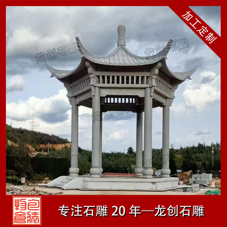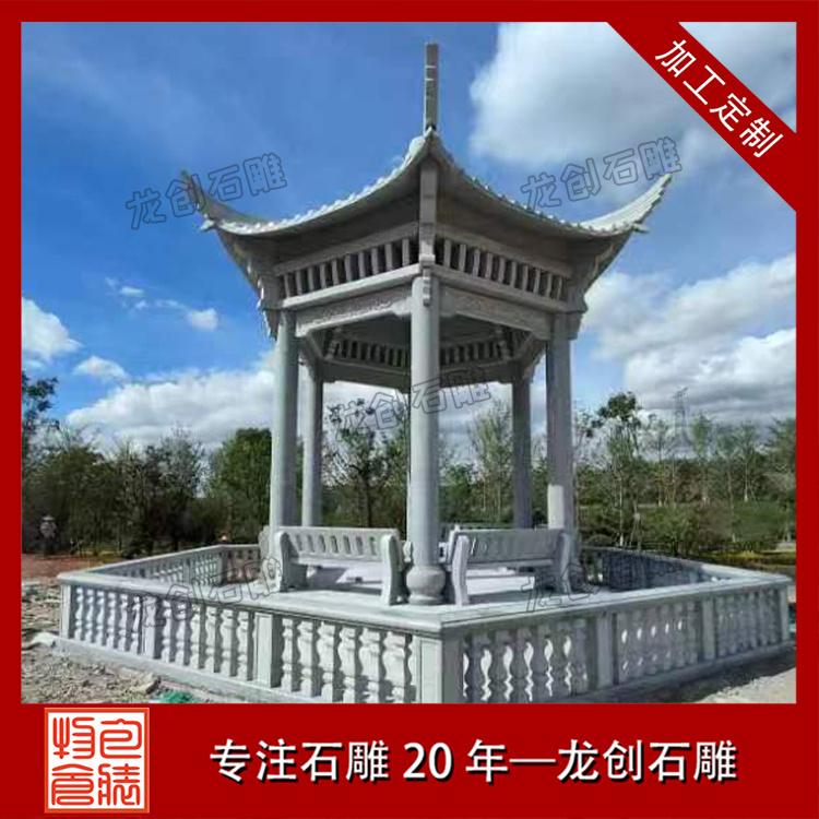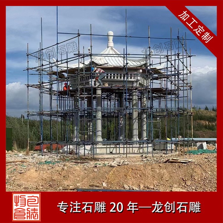 芝麻白六角石亭子 園林石涼亭安裝完成
