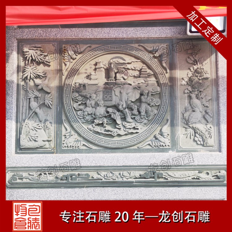 石材浮雕加工定制除了墻體浮雕壁畫雕刻外,還常集中在墻體的基座、墻身、墻檐、墻帽等處,無論是院內的院墻、墻頂的女兒墻還是大門旁的翼墻我們都能看到。體基座一般都由磚砌筑成須彌座樣式,而為了防水、美觀,也經常由石材筑成。基座常雕出虎牙形、卷草形圖案。墻身、墻檐、墻帽等處則是雕刻較多的地方,如采用多層浮雕、鏤空雕雕出場景深遠的美麗景色、戲文故事等,墻帽下檐雕出如連珠混、卷草彎等多種裝飾浮雕壁畫圖案。