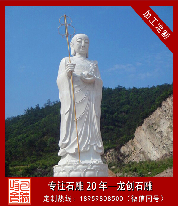 中國(guó)佛教寺院中的地藏菩薩形象很有特點(diǎn),一般菩薩為頭戴寶冠、身披天衣、瓔珞裝飾的天人相。而地藏菩薩則多為光頭或是頭戴毗盧冠,身披袈裟的出家僧人之相。一手持錫杖,一手持蓮花,或是手持幡幢、寶珠等。